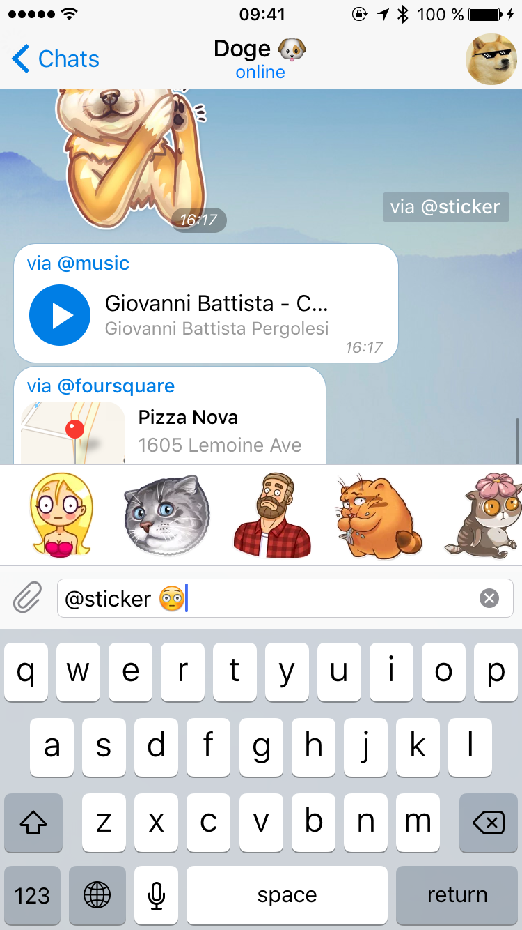 Inline bots support all types of content available in Telegram (20 in all). They are capable of sending stickers, videos, music, locations, documents and more.