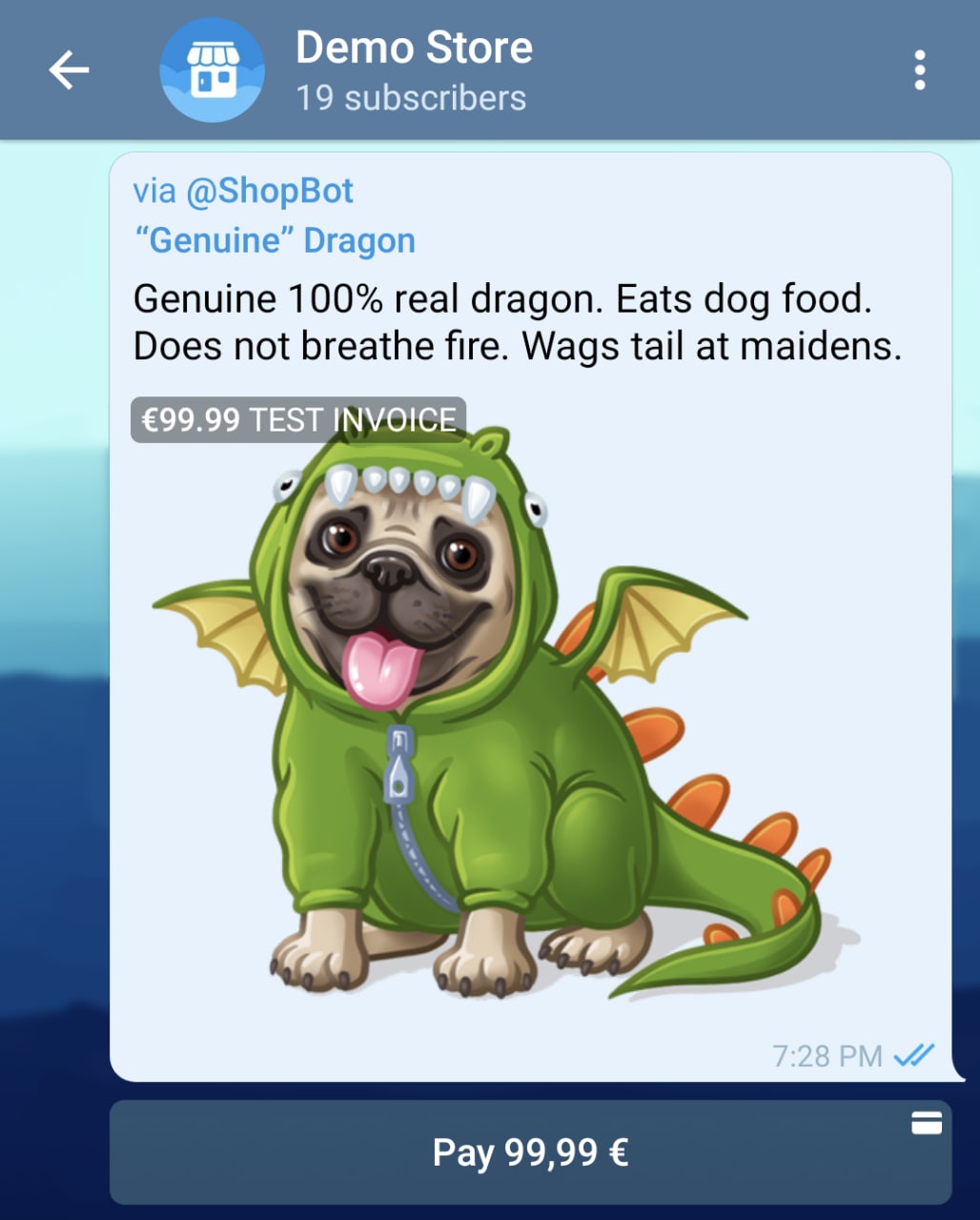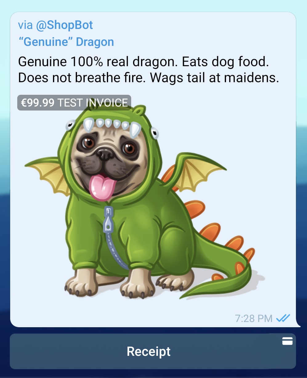 Invoice messages with a pay button can be sent to chats of any type: private chats with the user, groups, or channels. The resulting invoice message will look like this: